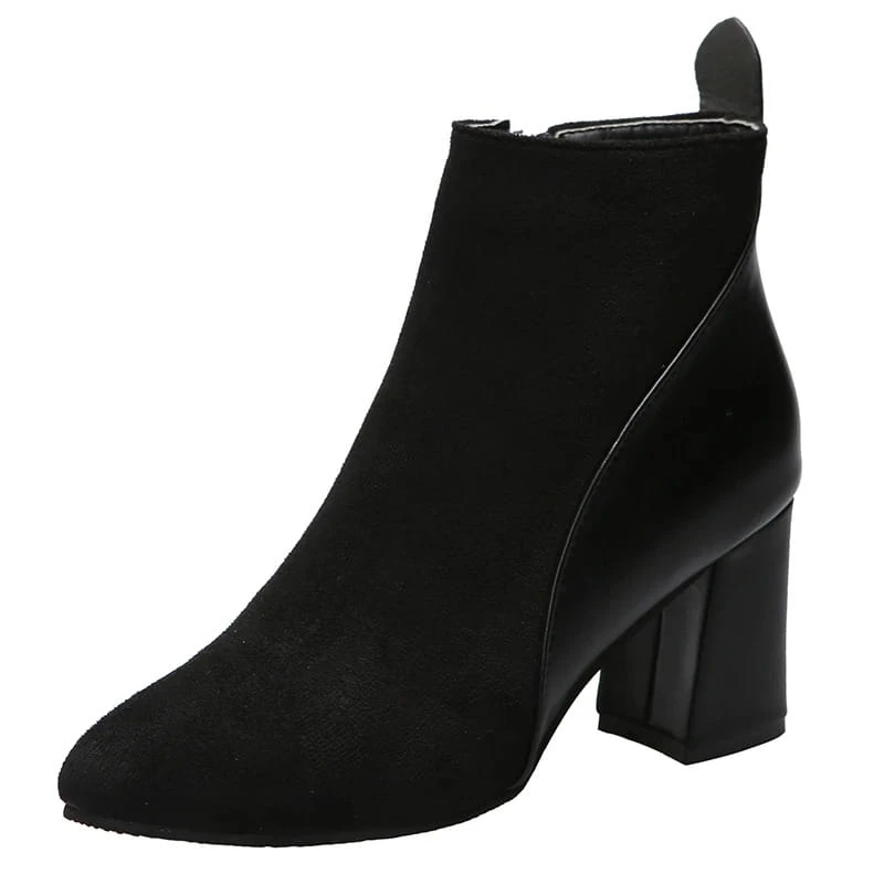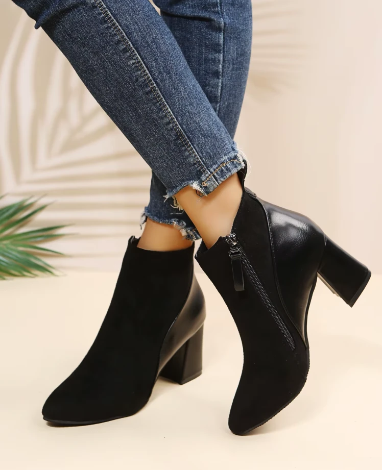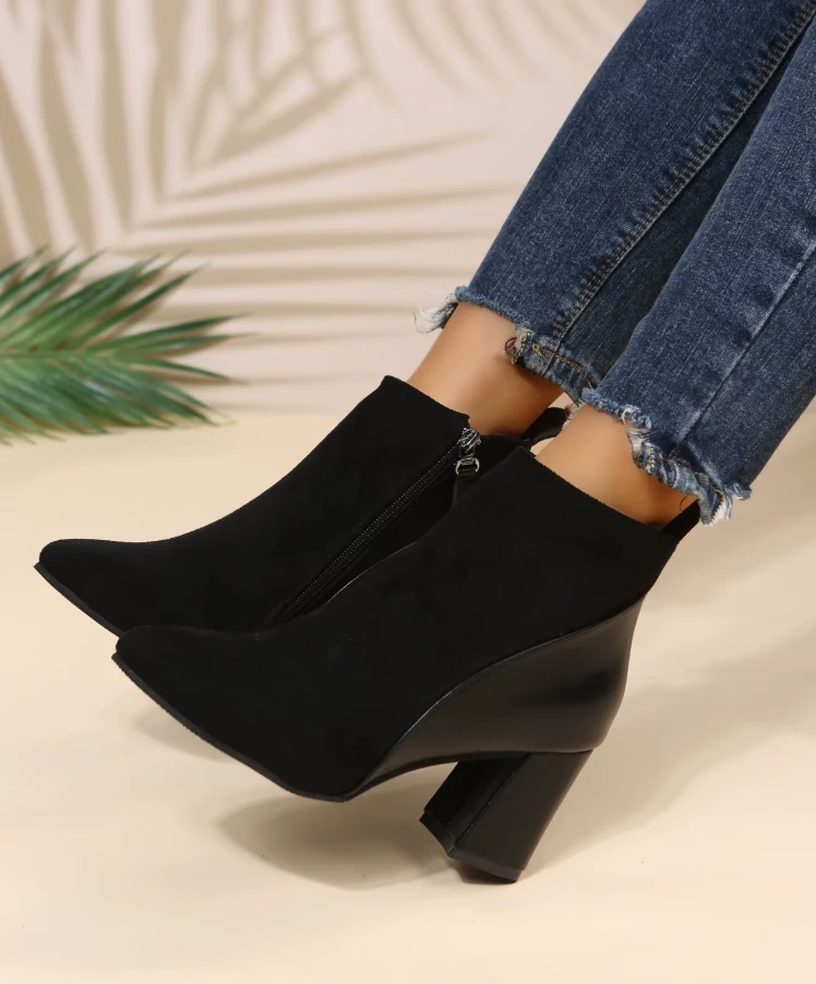 Damskie botki przejściowe na stabilnym słupku, wykonane z połączenia ekoskóry oraz materiału o strukturze zamszu. Obuwie posiada migdałowy nosek, boczny zamek błyskawiczny ułatwiający zakładanie oraz klasyczny fason sięgający za kostkę.