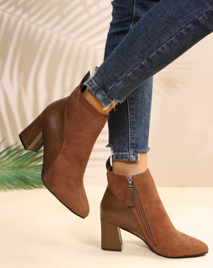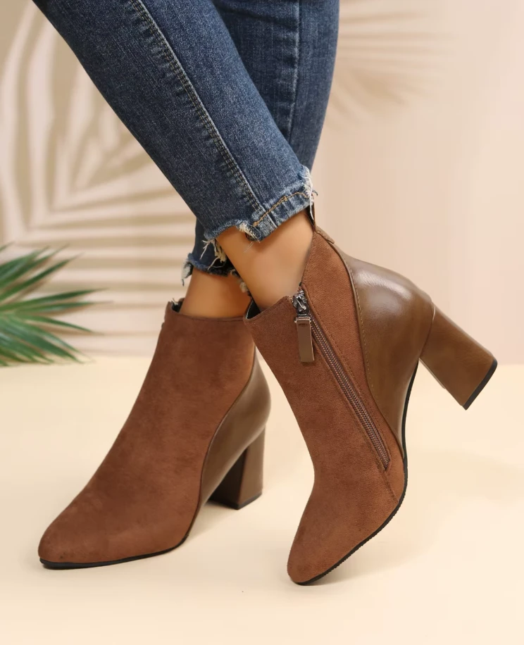 Eleganckie botki damskie zaprojektowane na sezon wiosenny i jesienny. Cholewka buta łączy dwa rodzaje wykończenia: tylna część oraz obcas wykonane są z gładkiej skóry syntetycznej, natomiast przednia część posiada matową strukturę imitującą zamsz. Takie zestawienie materiałów nadaje obuwiu nowoczesny wygląd, zachowując jednocześnie jego uniwersalny charakter.