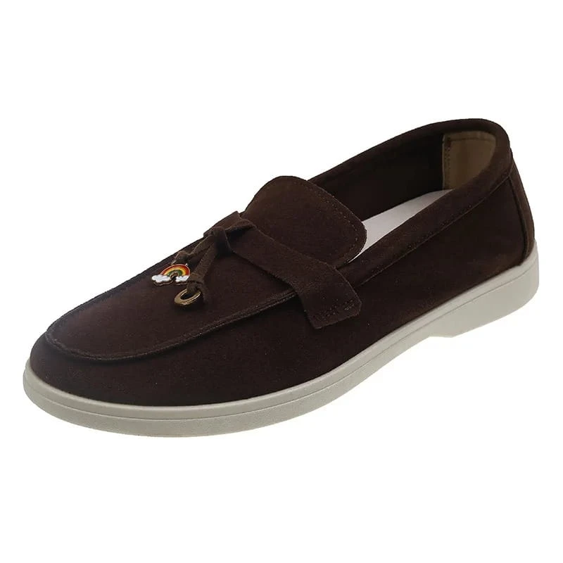 Te zamszowe lofersy to doskonała propozycja dla kobiet ceniących ponadczasowy design połączony z maksymalną wygodą. Cholewka została wykonana z wysokiej jakości zamszu, który jest miękki i świetnie dopasowuje się do kształtu stopy. Charakterystyczne przeszycia oraz ozdobny pasek na śródstopiu nadają butom klasycznego wyglądu, a subtelna przywieszka z motywem tęczy dodaje im unikalnego, radosnego charakteru.