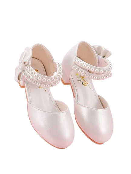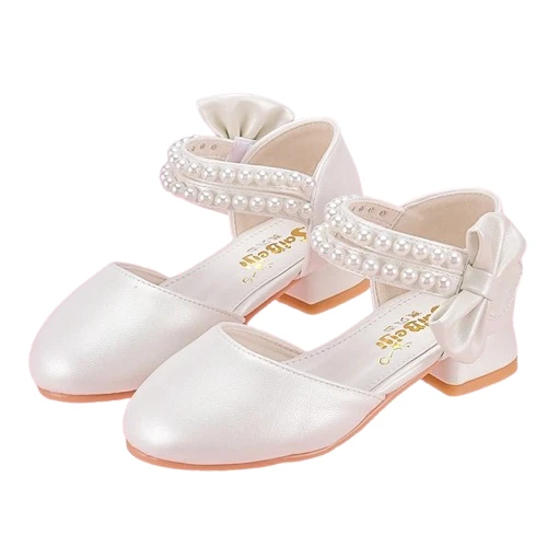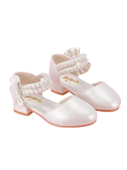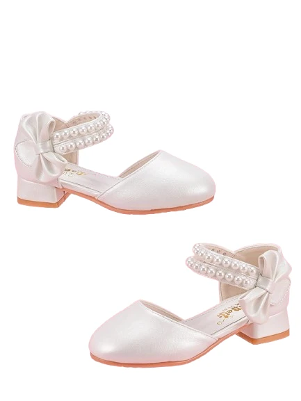 Stylowe buty wizytowe zaprojektowane z dbałością o każdy detal, aby zapewnić dziecku elegancję i komfort w najważniejszych chwilach. Cholewka wykonana z wysokiej jakości skóry ekologicznej (PU) posiada subtelny, perłowy połysk, który pięknie odbija światło. Wyjątkowego uroku dodają dwa paski wysadzane lśniącymi perełkami oraz duża, satynowa kokarda umieszczona z tyłu buta. Stabilny, niski obcas typu "słupek" zapewnia wygodę podczas chodzenia, a gumowa podeszwa gwarantuje bezpieczeństwo na śliskich nawierzchniach. Wnętrze buta zostało wyłożone miękkim materiałem, co minimalizuje ryzyko otarć podczas wielogodzinnych uroczystości.