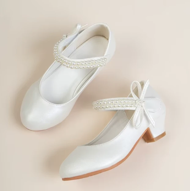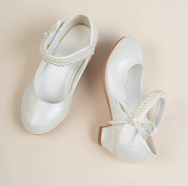 Eleganckie pantofelki wizytowe dla dziewczynek, idealne na Pierwszą Komunię oraz inne wyjątkowe uroczystości. Klasyczny fason z subtelnym perłowym połyskiem, ozdobiony lśniącymi perełkami oraz efektowną kokardą, łączy dziewczęcy urok z najwyższym komfortem noszenia.