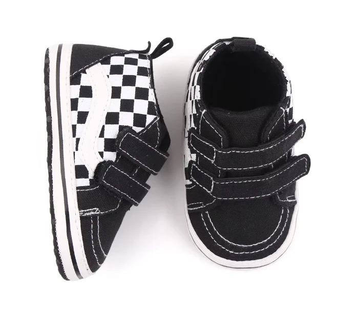 Stylowe i niezwykle lekkie trampki niemowlęce typu "soft sole", idealne dla małych odkrywców. Wykonane z miękkiej tkaniny canvas, z modnym wzorem w szachownicę i wygodnym zapięciem na rzepy, zapewniają komfort oraz stabilność podczas pierwszych aktywności niemowlaka.